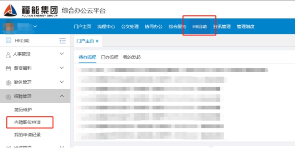 1.集團內部人員須獲得所在單位同意,并通過個人OA賬號登陸集團綜合辦公云平臺:http://10.1.15.15/,點擊HR自助并參照下圖所示路徑進入職位申請界面,選擇相應的職位在線報名填寫《應聘人員登記表》