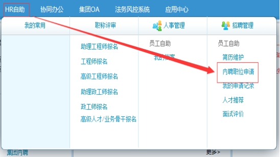 (一)福能集團內部應聘人員必須獲得所在單位同意,請通過個人門戶賬號登陸福能集團企業門戶:http://10.1.12.15:83/portal,并參照下圖所示路徑進入職位申請界面,選擇相應的職位在線報名填寫《應聘人員登記表》