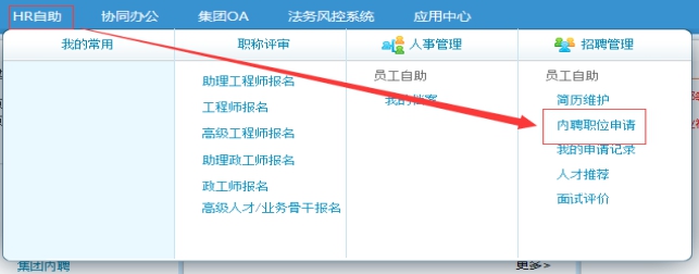 1.福能集團(tuán)單位人員應(yīng)聘報名必須獲得所在單位同意,應(yīng)聘人員請通過個人門戶賬號登陸福能集團(tuán)企業(yè)門戶:(門戶網(wǎng)址:http://10.1.12.15:83/portal),并參照下圖所示路徑進(jìn)入職位申請界面,選擇相應(yīng)的職位在線報名填寫《應(yīng)聘人員登記表》:
