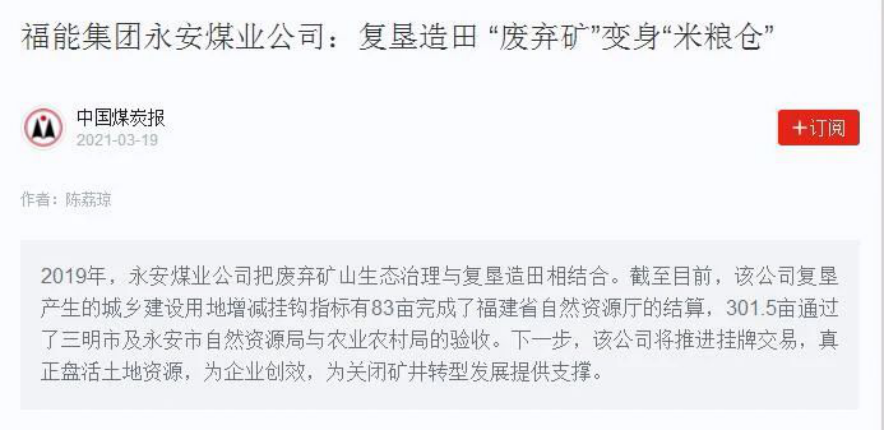 在福能集團的支持下,2019年,永安煤業公司把廢棄礦山生態治理與復墾造田相結合,計劃以耕地指標交易的方式為企業創效。